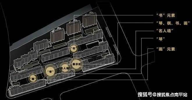 它将诗词歌赋融入社区的景观节点里,加入 “琴”、“棋“、“书”、“画”、“名人墙”等文化元素。