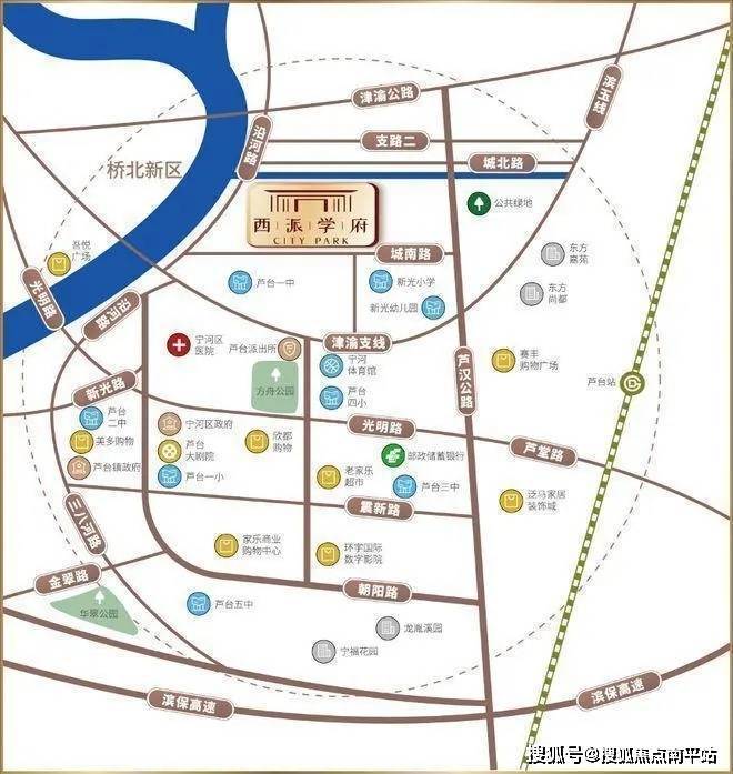 项目位于蓟运河畔、 芦汉延长线与城南路交口,邻近宁河芦台老城区,距芦台站不到2公里。南侧配套新光幼儿园,临近 天津实验小学宁河分校芦台一中、芦台三中