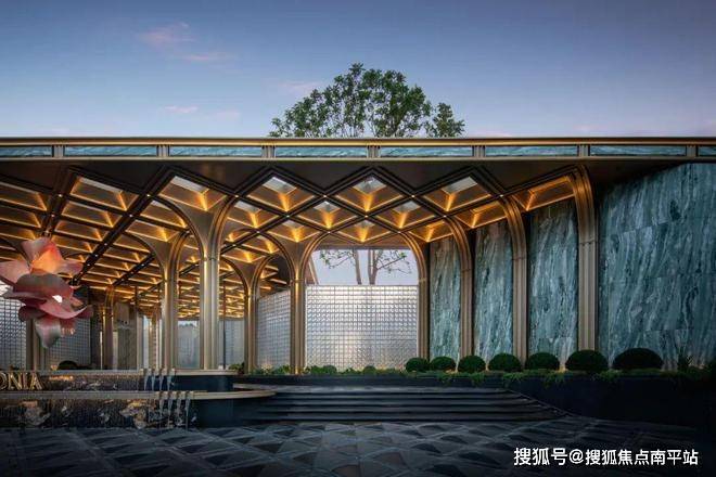 同样抢眼的,还有约20根约7米高的香槟金色立柱——海棠玉树,融入了传统的斗拱、榫卯技艺,搭配太阳纹的琉璃砖,整体看上去非常挺拔、通透。