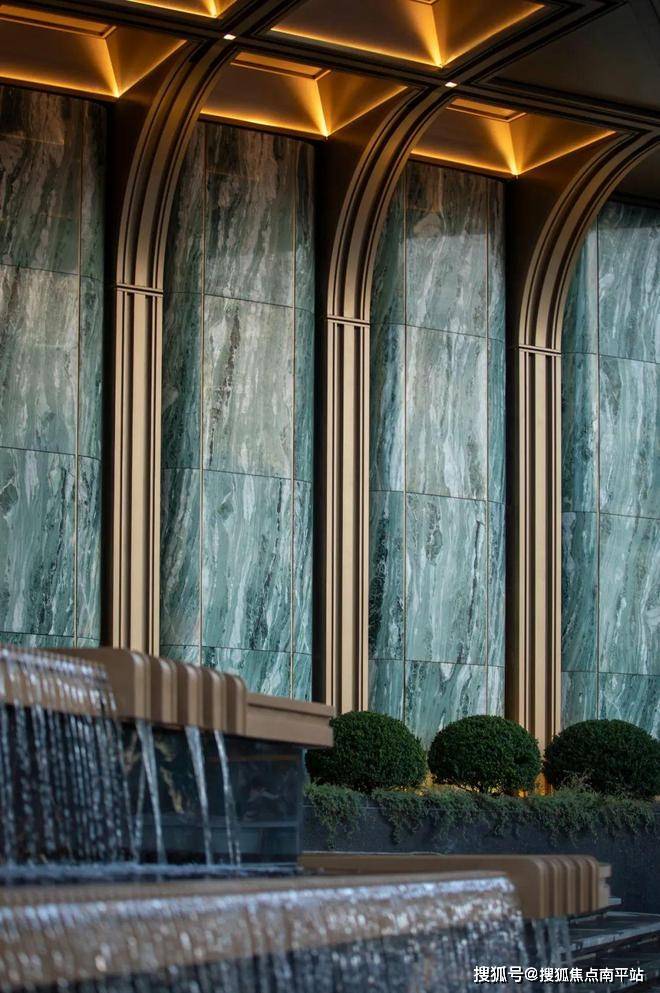 又比如,中央水景的池底和池壁,运用了宇宙黑金,让水面显得格外澄澈,层层叠瀑倾泻而下,与上方的海棠花雕塑相映成趣,为归家之路增添了灵动感。