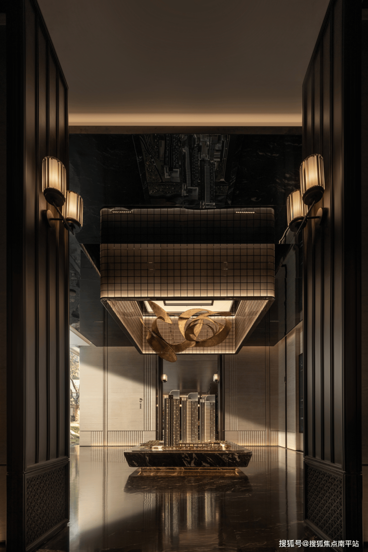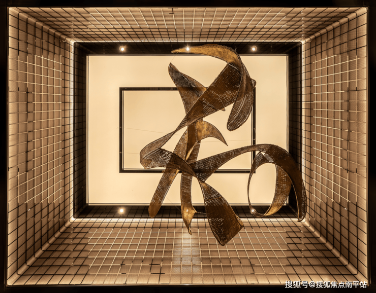 沙盘区悬置的金属雕塑来自湖南非遗技艺粽编,金色漆面的装饰与四周鎏金质感的艺术玻璃相得益彰,营造层次丰富的空间感受,给予独特的视觉张力,让访者获得多感官的沉浸式体验。