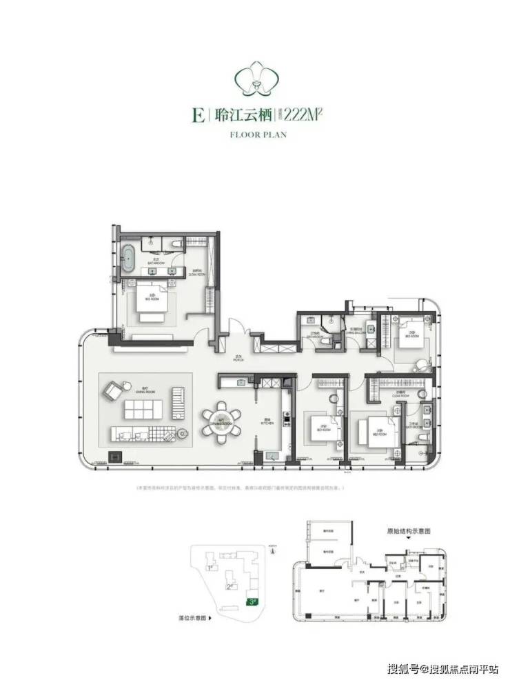 主力户型-聆江,建面约222㎡, 四室两厅三卫设计,江景面在西侧,并且是没有任何的遮挡,大转角的设计客厅占据最好的江景资源,双套房设计,参照轻奢酒店行政套房标准,打造主人专属尊享空间,从独立衣帽间到奢华卫浴,每一处细节皆彰显非凡品位。