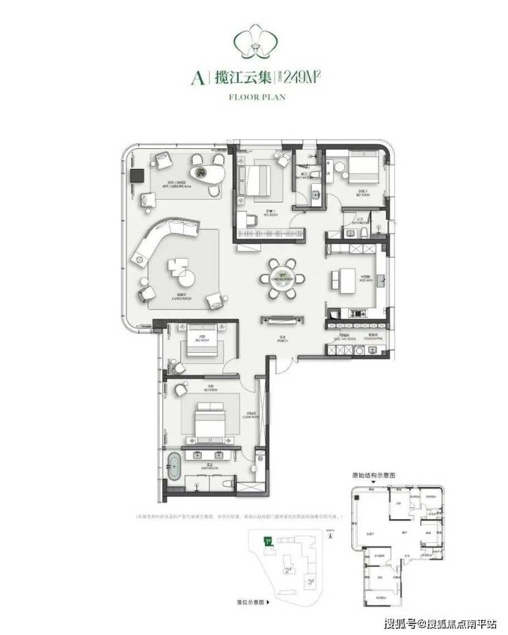 主力户型-揽江,建面约249㎡, 四房三厅三卫双套房设计,根据江景位置,高定角厅270°观江户型。