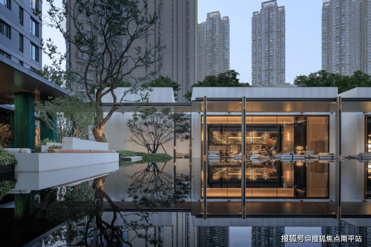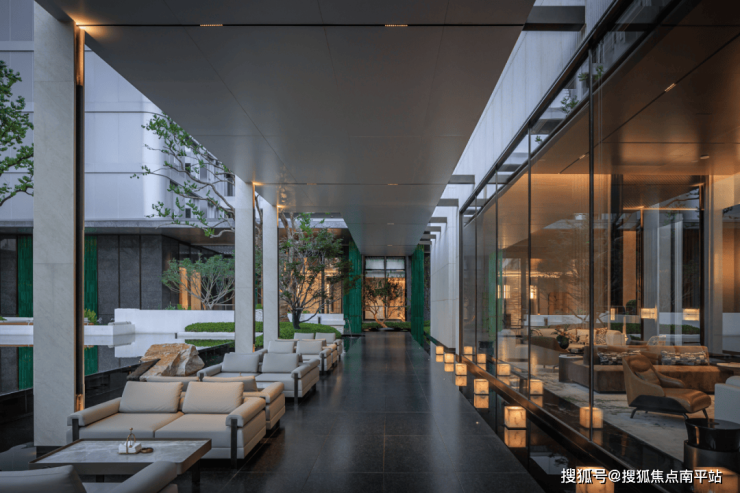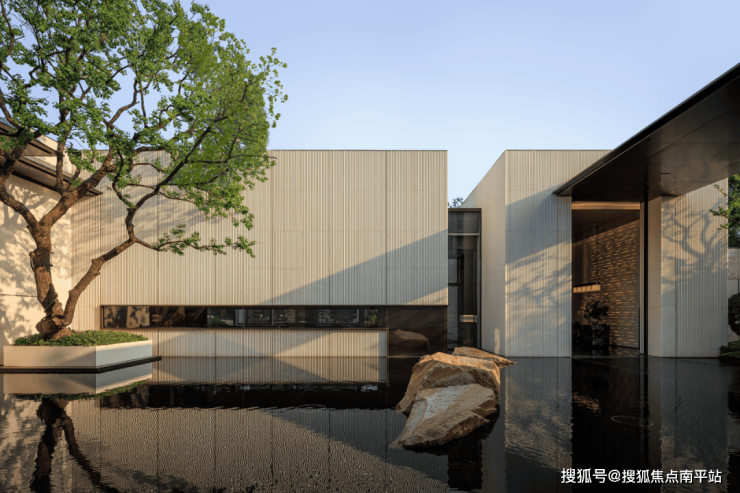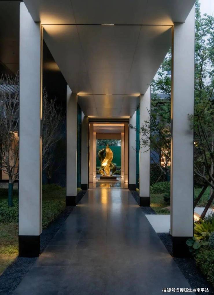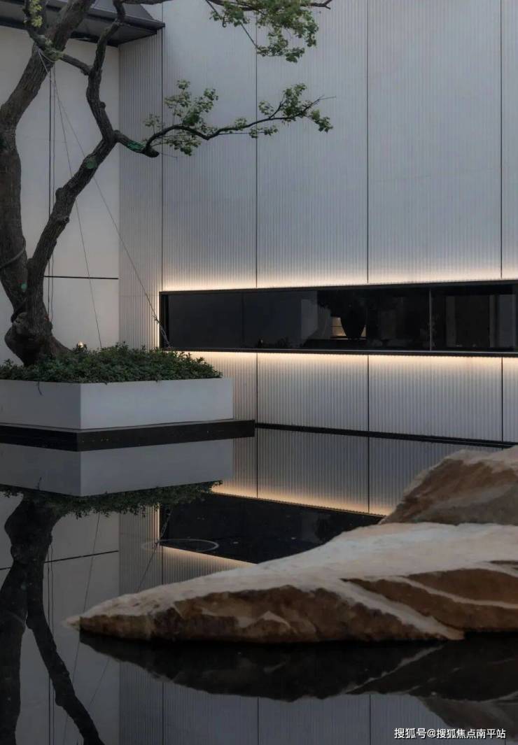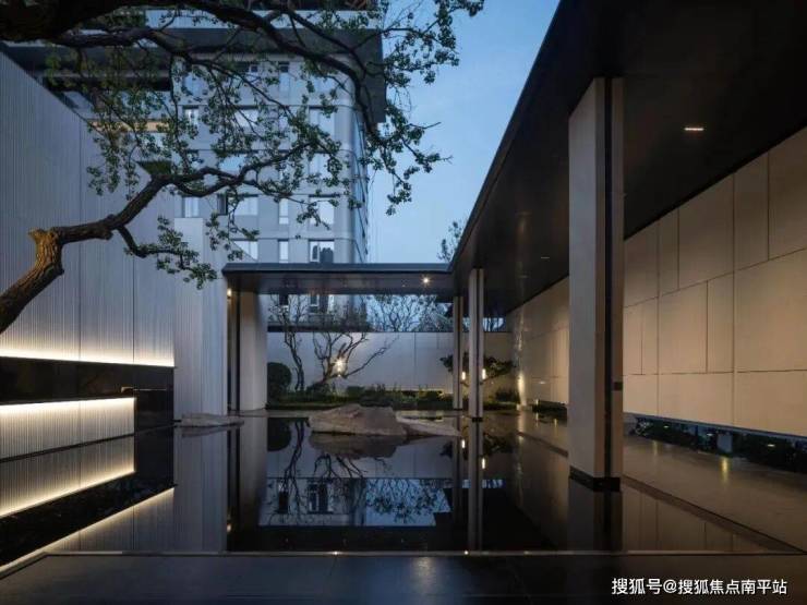 穿过会所,便达中心水院。连廊的进退、水面的镜影、墙的肌理与地面的纹路,以线性韵律将空间串联成诗。归家动线不再仅是路径,而是步移景异的视觉叙事。