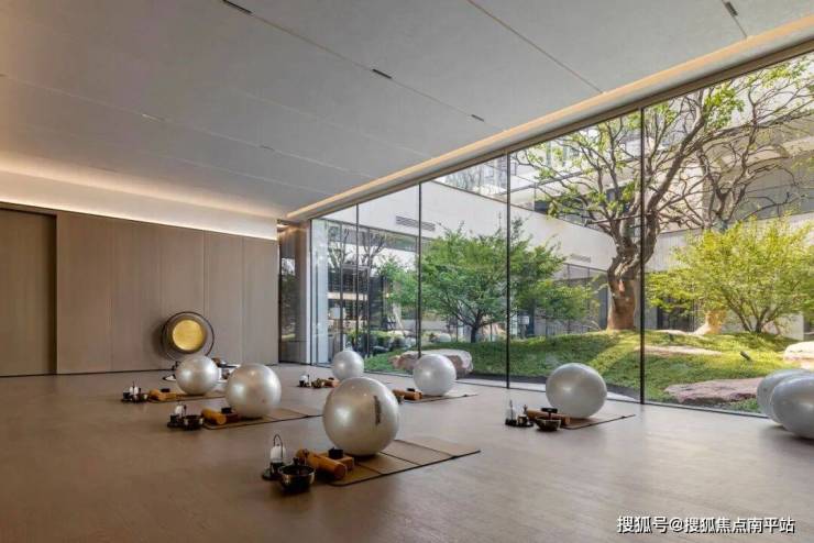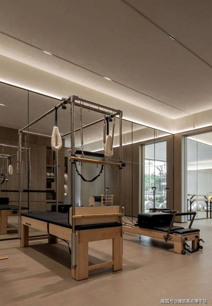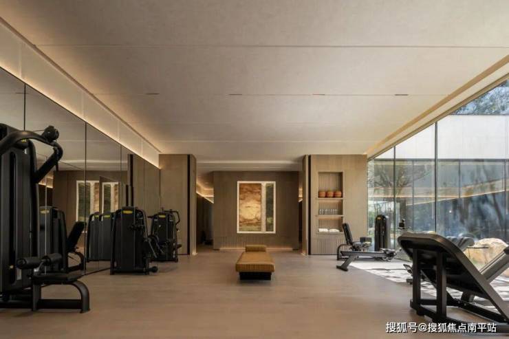 健身区、私教区与瑜伽区无缝衔接,构建出促进放松身心、恢复活力的和谐空间,无界窗景突出了自然度假之感。