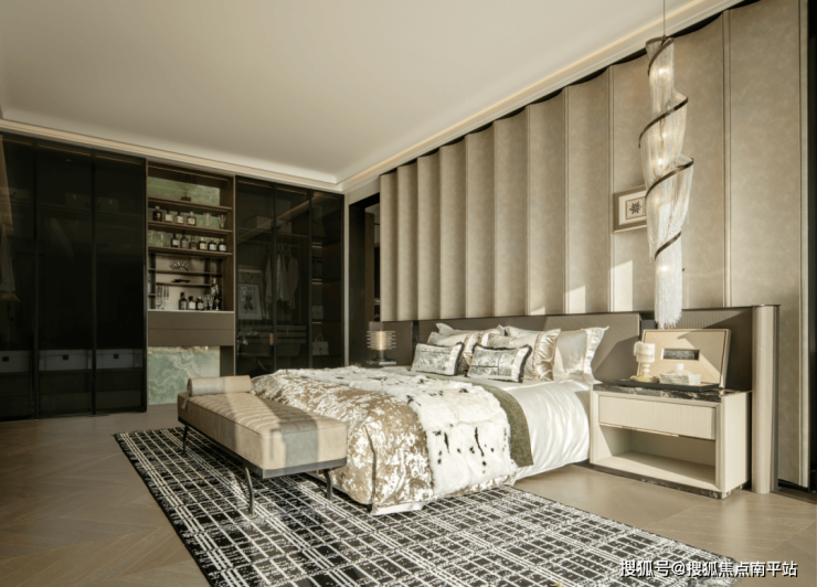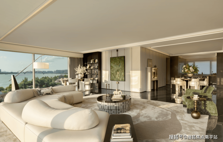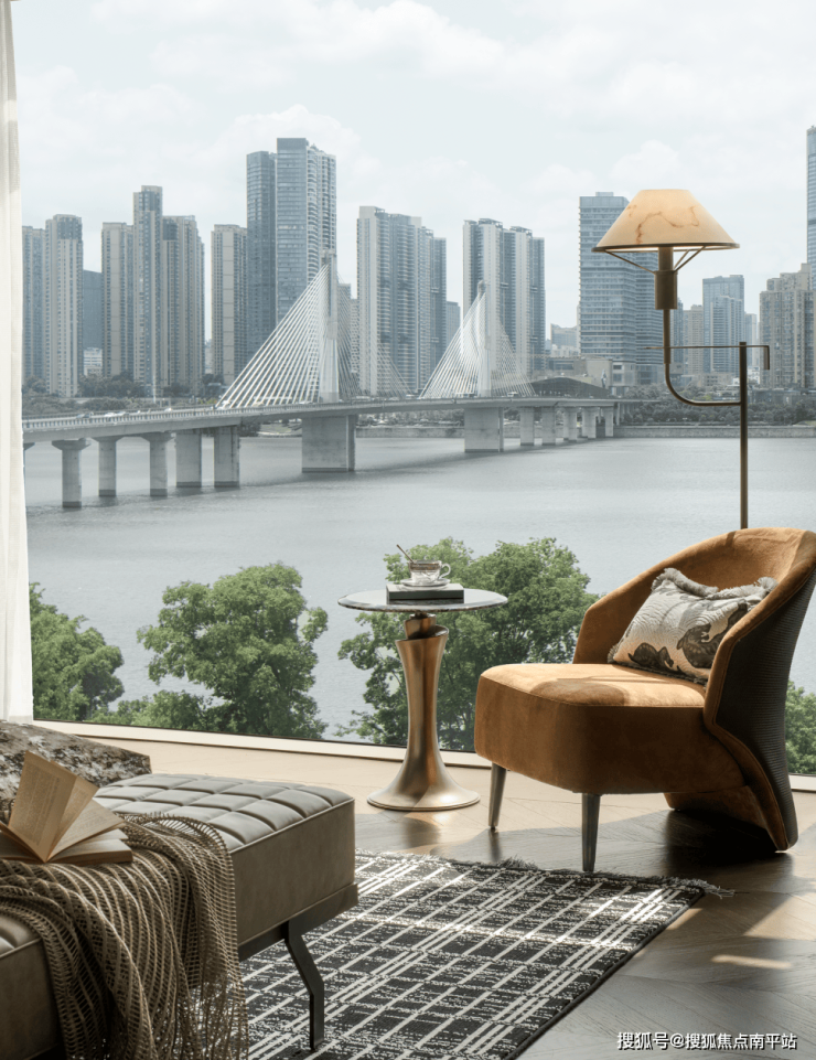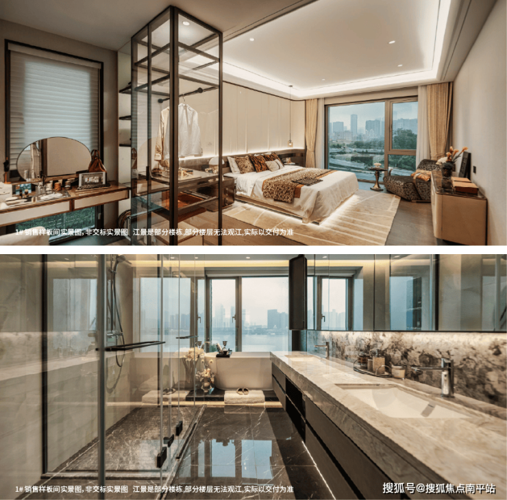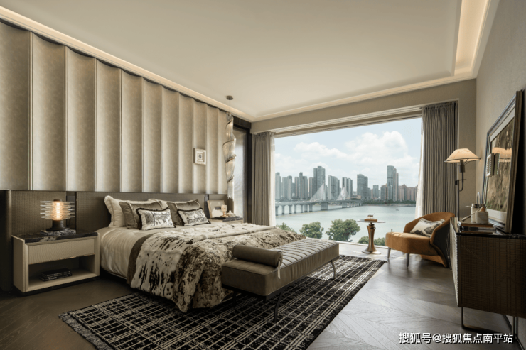 户型设计上,客厅、主卧等主要功能空间均朝向江面,且采用大尺度落地窗设计,将江景最大限度引入室内。行政主卧套房,配备独立衣帽间、双台盆卫浴、270° 观景飘窗,打造专属的私密空间,尽显尊崇,让人在休憩时也能将江景揽入怀中。