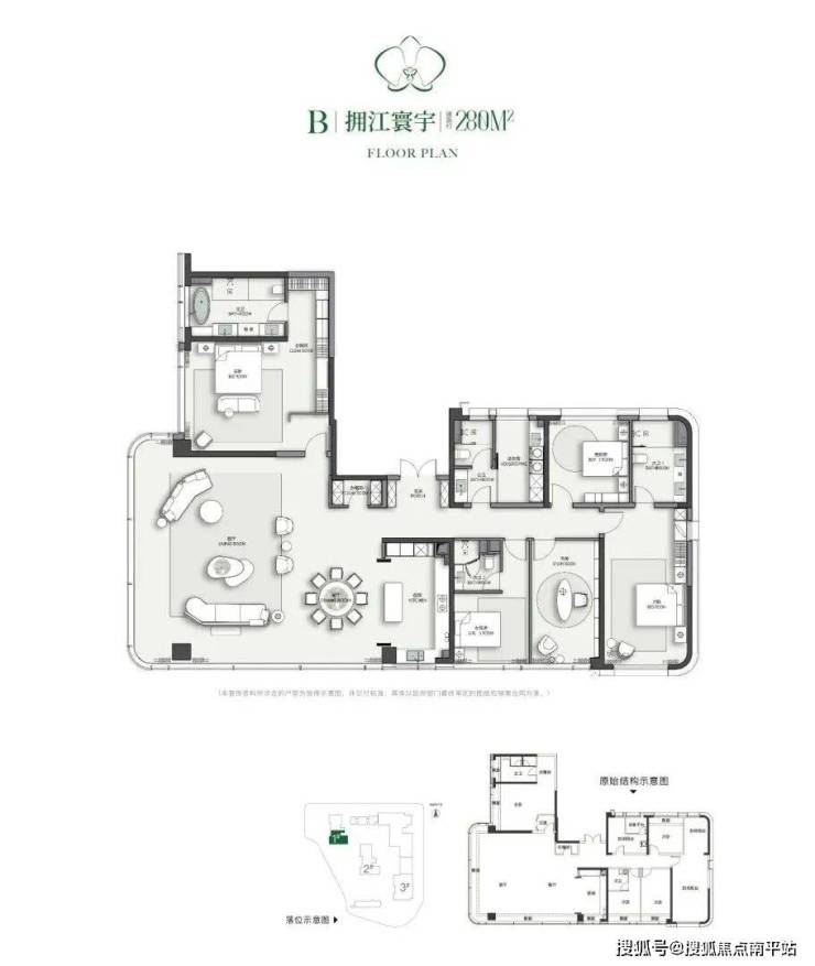 主力户型-拥江,建面约280㎡ ,五房三厅四卫三套房设计,此产品为本项目最大面积段产品,产品不仅拥有270°巨幅角厅,还拥有23m的纯南向江景和园景视野,整体观江面长度达到43m。
