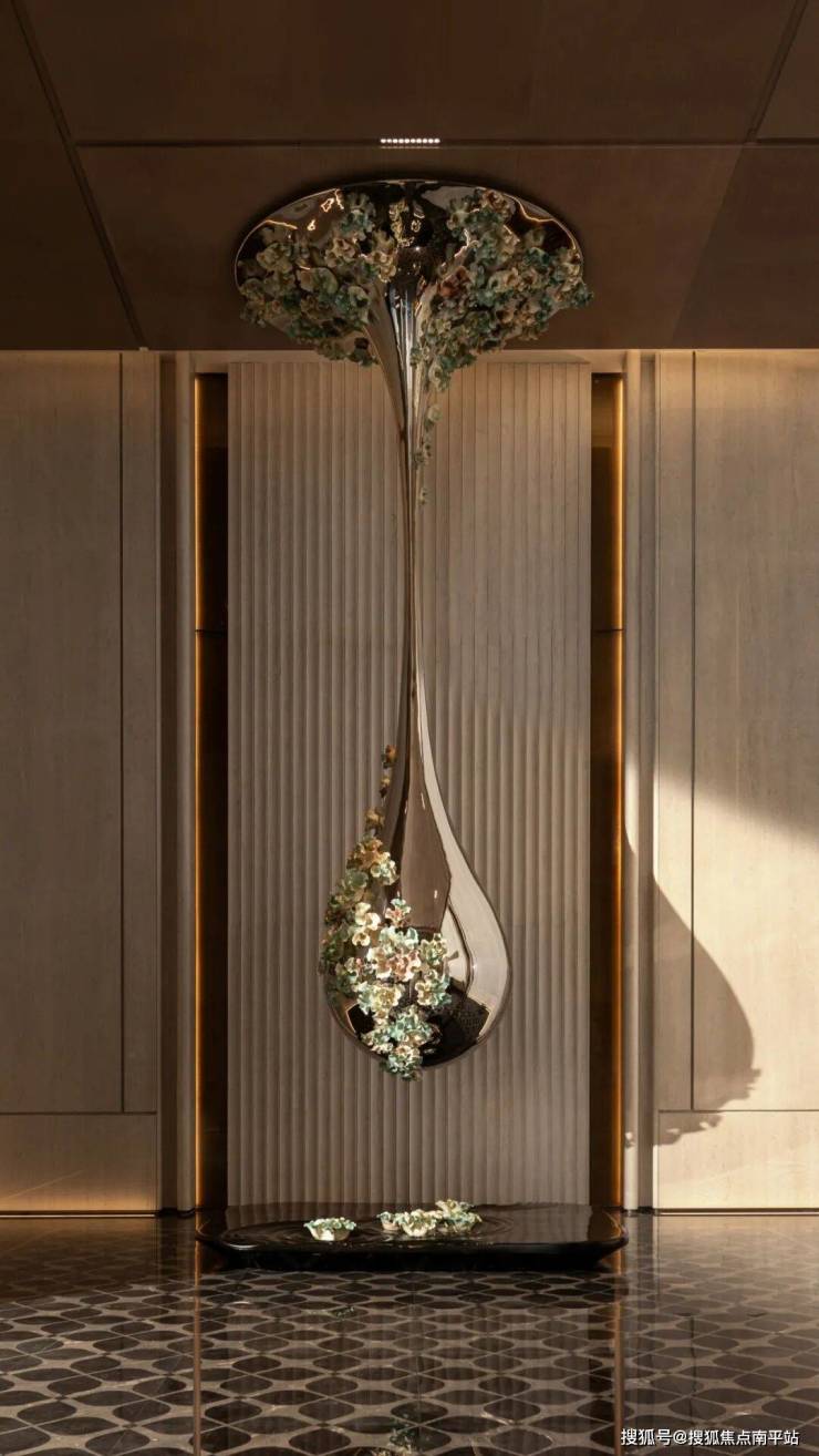 天花的琉璃飞鸟群装置,以振翅欲飞的姿态悬垂于穹顶,通透的材质在光影下恍若凌波起舞。在自然与艺术的交响中,空间以动态的艺术语言构建出极具仪式感与尊贵感的抵达体验。
