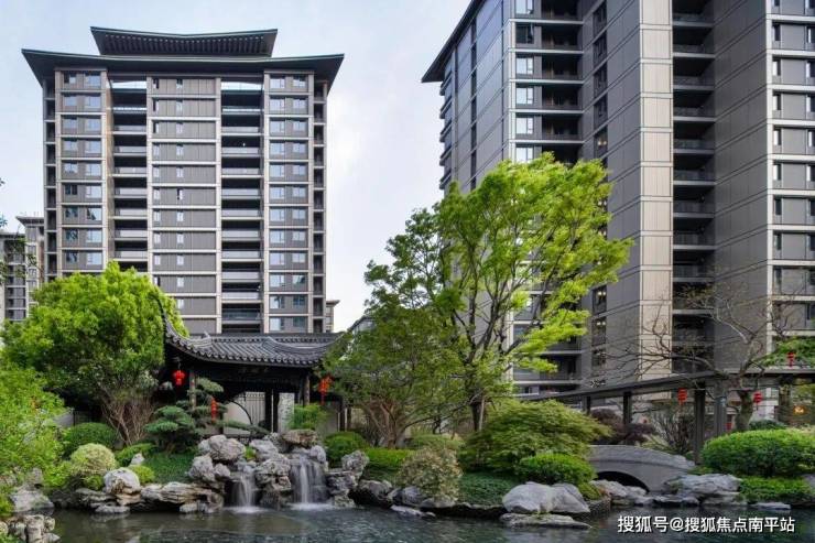 小区外立面大面积采用香槟色铝板(南面)与线条搭配,简约现代;楼栋设计融入中式飞檐造型,传承东方美学。内部绿化层次分明,乔木、灌木、草坪错落有致,营造自然与现代兼具的社区氛围。