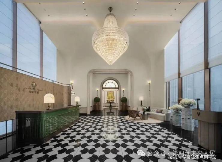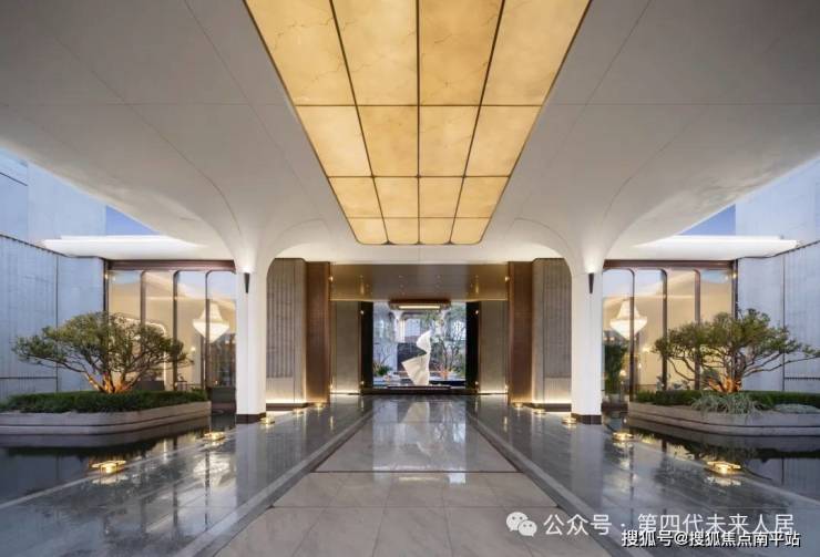 建筑立面同样暗藏巧思,以“芝兰玉树”为灵感,浅灰色石材打底,金属线条勾勒挺拔轮廓。顶部格栅造型模拟玉树冠层形态,成为独特建筑符号;金属漆、仿石涂料与铝合金线条的精妙组合,让立面在阳光下呈现流畅光影,简约中透着精致,使建筑宛如生长在土地上的风景。