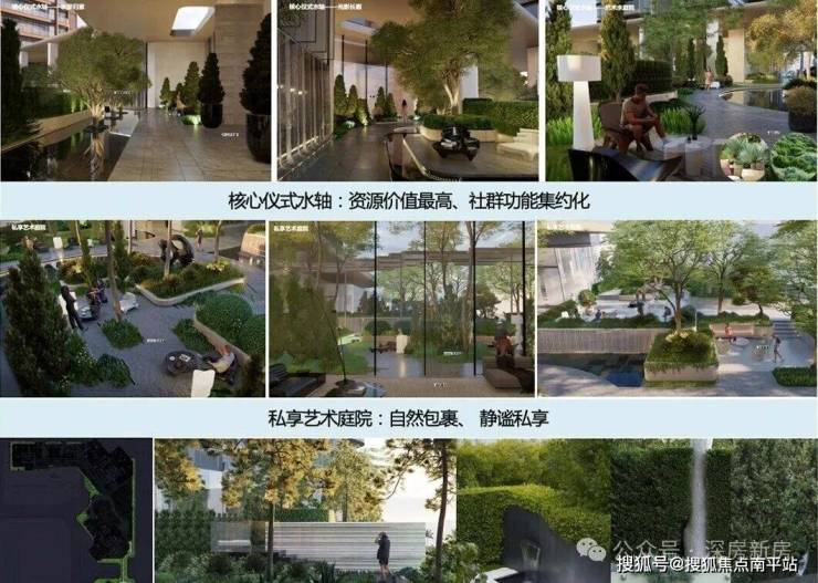 项目利用裙房屋顶打造拥有“仪式水轴“艺术庭院”“空中浮岛森林”三级景观设计的空中庭院,四栋住宅均漂浮于甲板之上,独享甲板庭院花园,以“海风吹拂下的豪宅底盘”托举城市上空的豪宅群落,形成立体景观系统。