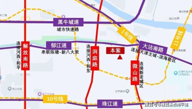 三纵四横多轨立体交通,黑牛城道、大沽南路、洞庭路等城市骨架道路,地铁1号线、10号线、11号线三大地铁交汇,出行高效便捷。