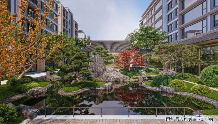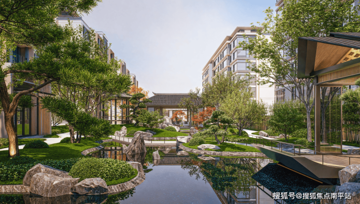 每个宅间都是庭院布局,实现户户有景, 将亭台楼阁、飞石流瀑、水榭廊亭等穿插其中,打造游园式动线体系。