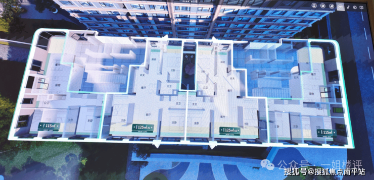 建面约115平的边套三房:分布在1号楼端头边户,3个卧室朝南,餐客厅一体全景舱设计,带独立电梯前室。