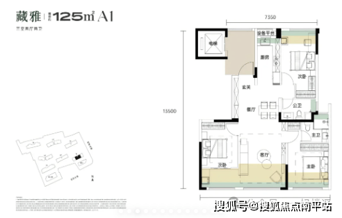 建面约125平单元拼接处户型:位于1号楼单元拼接处夹边户,三房两厅两卫,4个主要空间均带阳台+花池优化面积,三房设计,带独立电梯前室,结构相对比较常规。