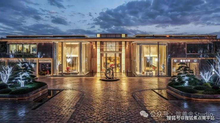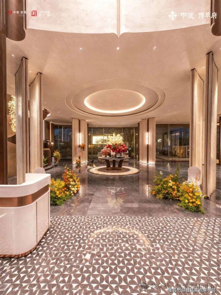 近百米宽、近十米高的宏伟尺度,第一眼便足以震撼人心。大门两侧由18块全幕落地玻璃构成,两侧矗立的气派造型罗汉松,更添豪宅气场。穹顶采用双层铝板打造的“星空顶”,超过300片鎏金鳞纹铝板全手工拼接,并镶嵌300余盏星灯,归家时刻的仪式感被拉满至极致!