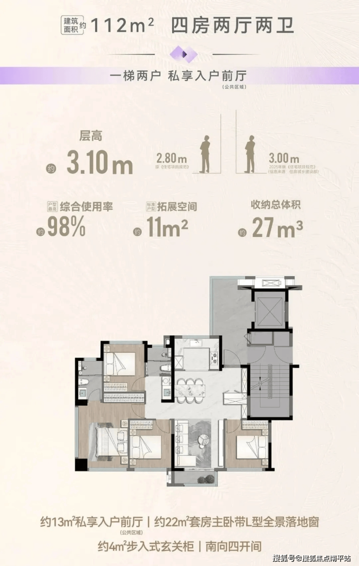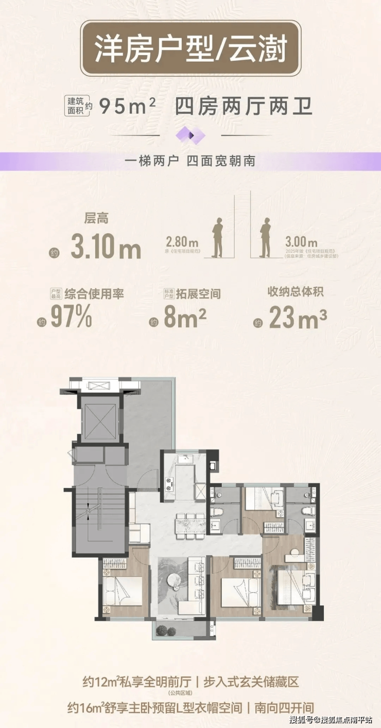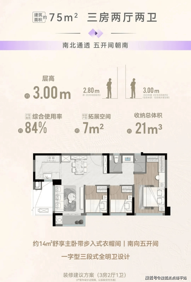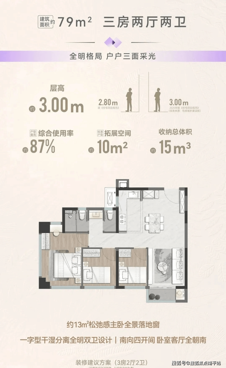 规划4栋高层2梯5户,64㎡2房、75㎡3房、79㎡3房、89㎡四房(得房率85%—90%)层高3米。5栋洋房1梯2户,95㎡四房、112㎡四房(得房率97%—98%)层高3.1米。户户均有外阳台。