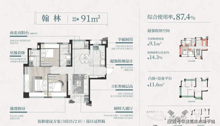 厦门90㎡面积段在售新房中唯一南北双阳台,综合使用率达到87.4%,比市面高出10-12%!5.2米超长厨房台面,四扇通高玄关柜,三卧室大容量通柜,实现了同级产品中最强收纳!