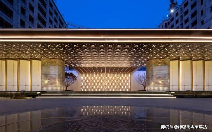 社区主入口以51米恢弘界面铺陈,6米挑高构筑超尺度空间,营造尊崇归家仪式感。米黄色贝金米黄石材与古铜色金属相映成辉,细节处雕琢入微,每道工艺皆藏匠心。弧形紫气东来奢石,以独特的紫色为底,纹理蜿蜒其间,恰似川流不息的河流和逶迤绮丽的山川,展现磅礴大气的东方美学。造型突破大理石固有形态,化作流动弧面,成为归家动线的视觉焦点。
