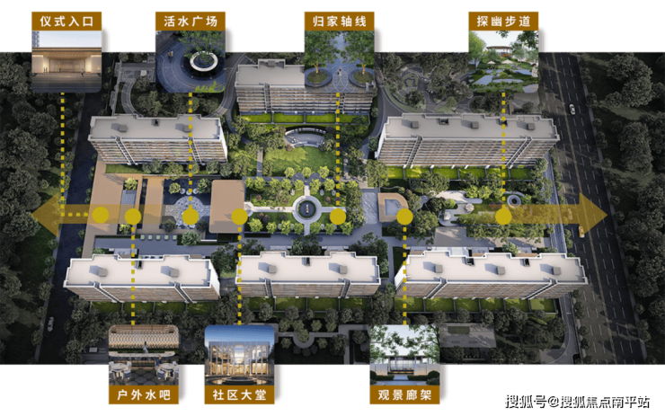 以独特的超级社区底盘设计概念,通过架空平台,整体抬高5.3m,构筑漫步街角公园、商业街区、社区大门、中心庭院,双重归家等多维复合空间。业主可以通过市政道路平进车库,亦或是通过花园楼梯上至架空平台上,通过园林庭院归家。