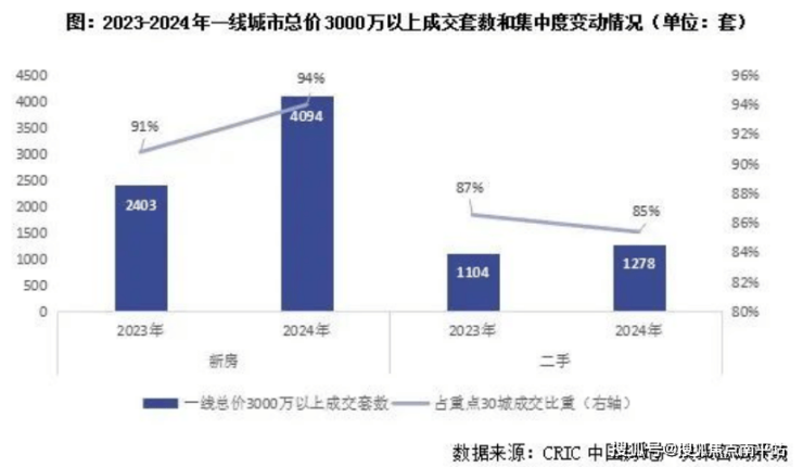 据市场监测数据,2024年全国30个重点城市总价3000万以上的高端住宅新房成交4356套,同比增长65%,其中一线城市成交量占比高达94%。这一数据与行业整体调整态势形成鲜明对比,印证了核心城市高端住宅市场在行业下行周期中,展现出的强大抗风险能力与资产价值韧性。