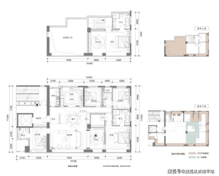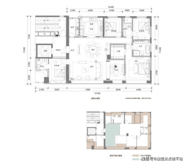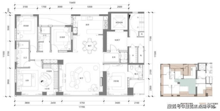 布局方正,客餐厅面宽约 5.6m,得房率约 114%,一梯一户、四开间朝南;美中不足是老人房无独立卫浴。