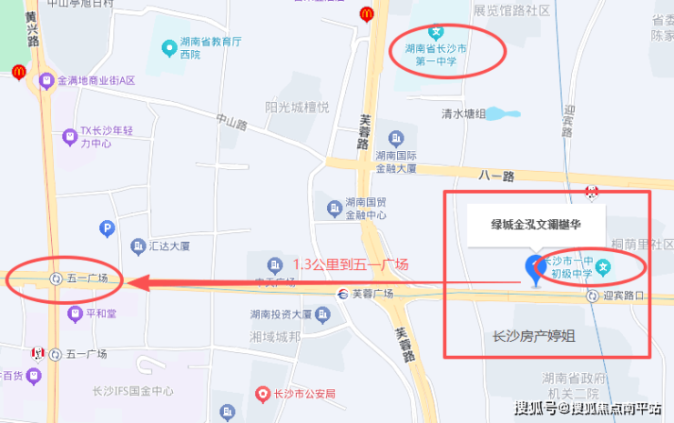 1.3公里到五一广场、IFS、王府井,1公里内到省人民医院、湘雅二医院;