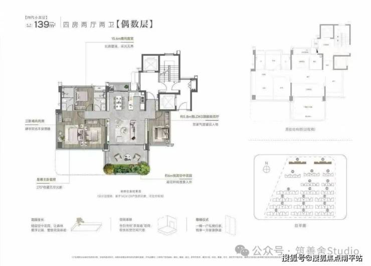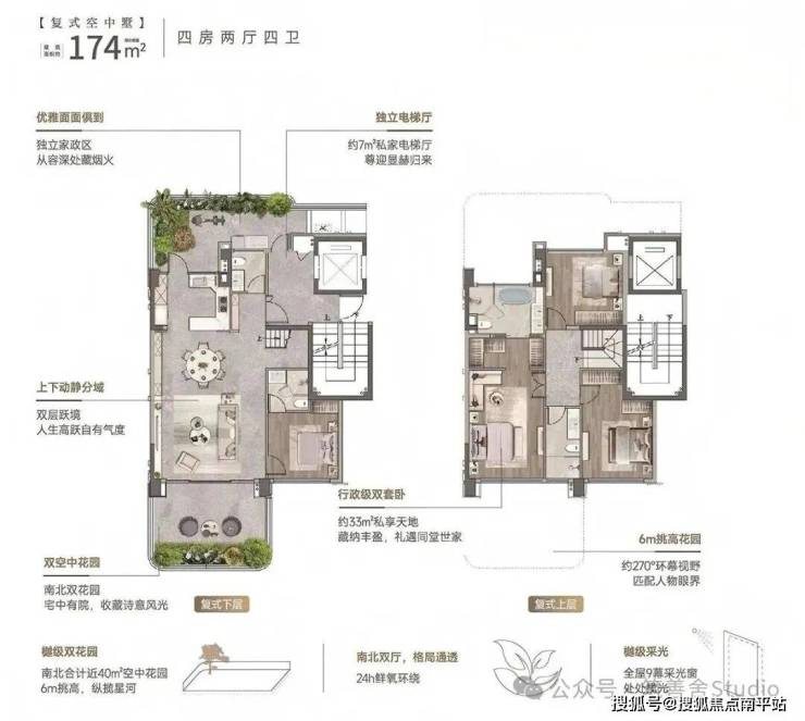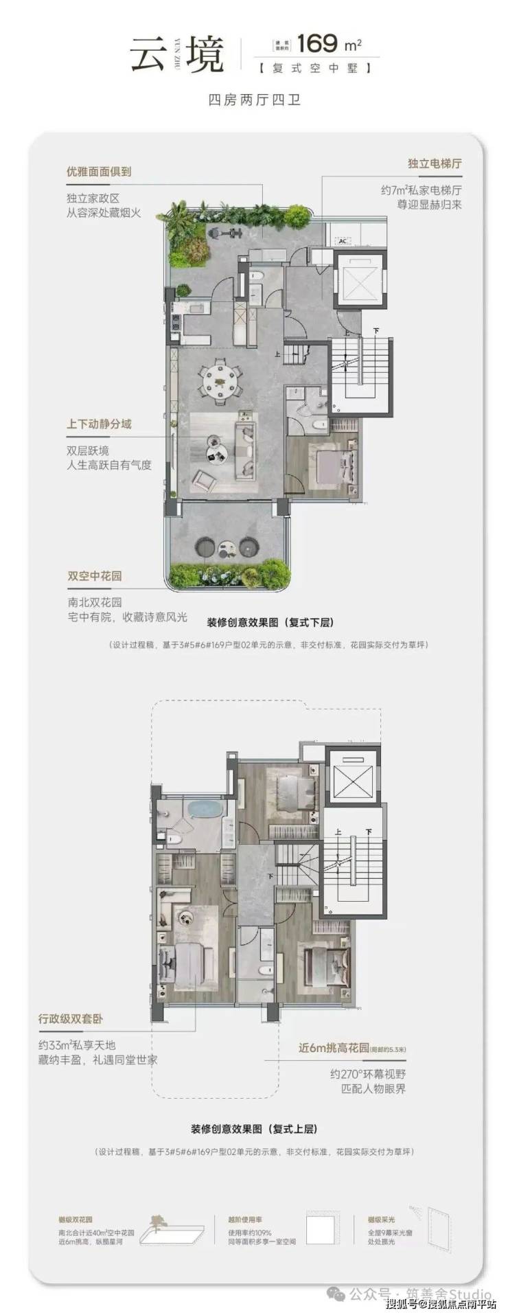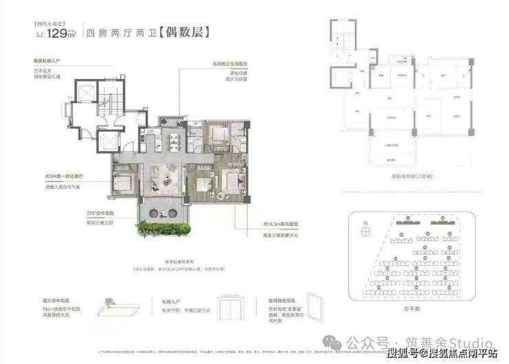 小高层户型,建筑面积约129-139㎡的四代小高层,采用错层挑高设计,配备空中花园与私梯入户,并拥有约3米的层高配置,全方位提升空间的别墅级居住体验。