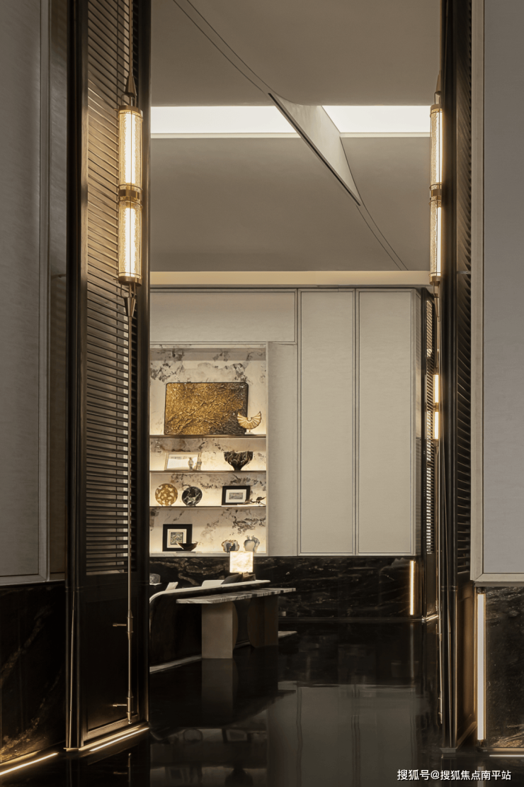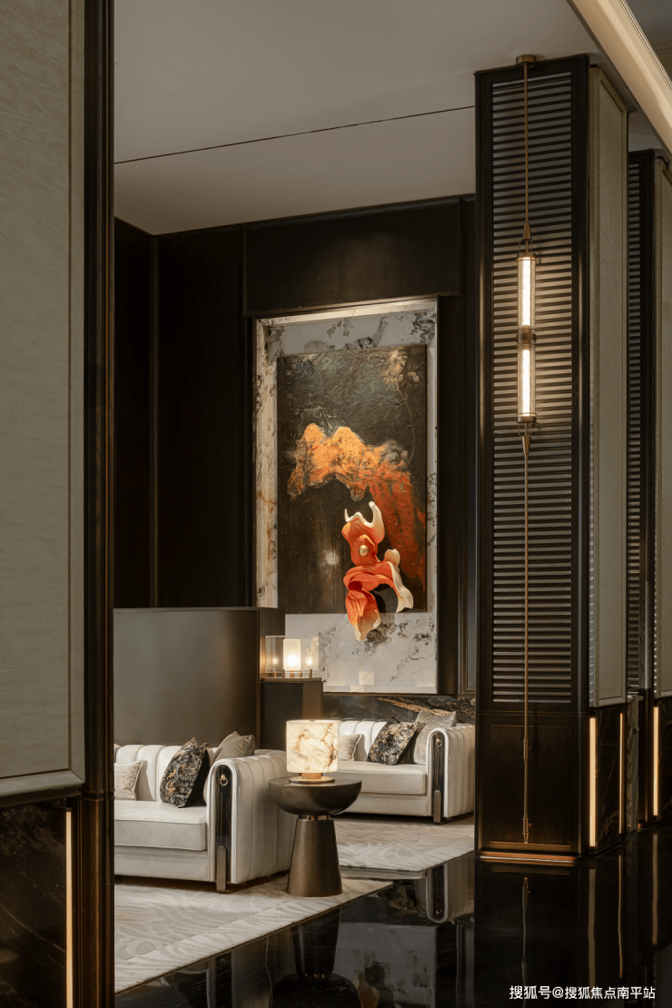 借柜体、屏风强化空间围合感,打造隔绝干扰的私密场域,构建舒适交流圈,搭配金属、大理石质感的边几,柔化材质的冷硬,暖调灯与桌灯交织出温润光影,辅以艺术挂画点缀,既保有隐奢质感,又透出松弛自在的气场。