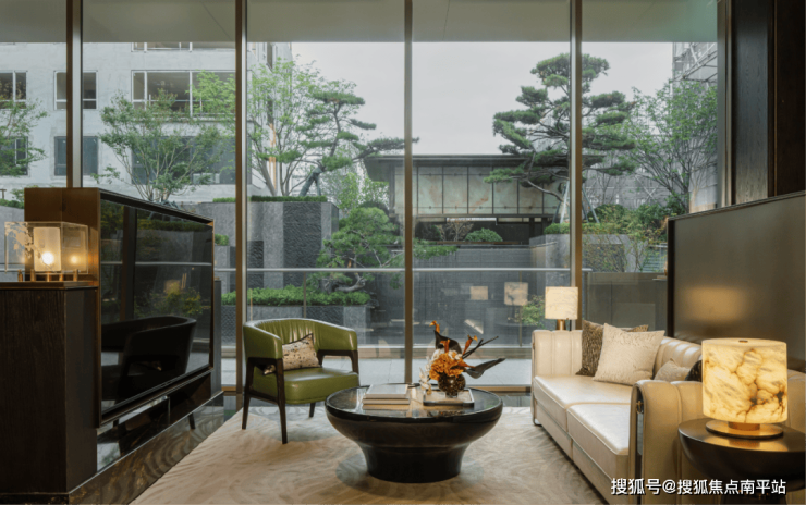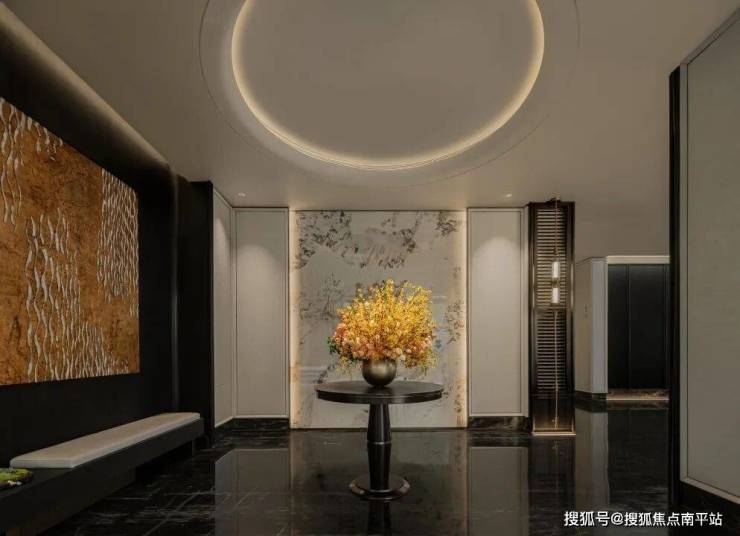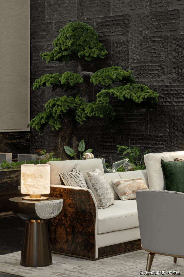 删繁就简,唯余通透,环形灯带与壁灯以光裹住场域,柔光掠过微景绿植与碎石造景,将园林的松弛隐入现代材质的精致——是轻奢的仪式感,也是禅意的静。