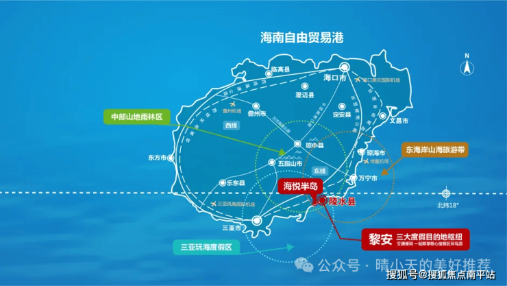 海悦半岛位于北纬18°以南,处于三亚滨海度假区与中部山地雨林区、东南海岸山海旅游度假区交汇区域,进可热带山海,退可一城繁华。于此,开启伴城伴山伴海的美好假期。