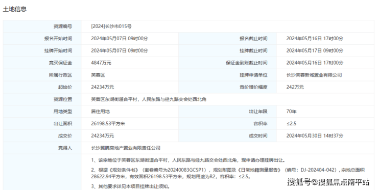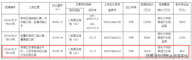 (2024)长沙市015号地块由衡阳常宁万象房地产公司于2024年5月以底价24234万总价竞得,楼面价3700元/平方米,容积率2.5,住宅面积约6.3万方。项目位于长沙市芙蓉区人民东路以北,临近湘域芯城、合平村安置小区,靠近地铁6号线-韶光站,周边有芙蓉区大同三小等教育配套。