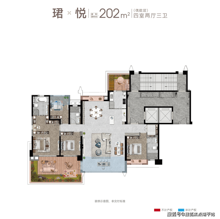 以 建面约163㎡奇数层户型为例,LDKX-Y的先进性布局,打破了室内外空间的边界,让整体空间格局更加比例均衡,公区面积也得到尽致拉伸,最大可构建出约54㎡会所式家庭聚会场,真正实现建筑与环境、自然与室内生活间的高频互动。而 建面约202㎡户型甚至能带来近100㎡社交场域,实现超高的公区升维,为居家生活打开更多可能性。