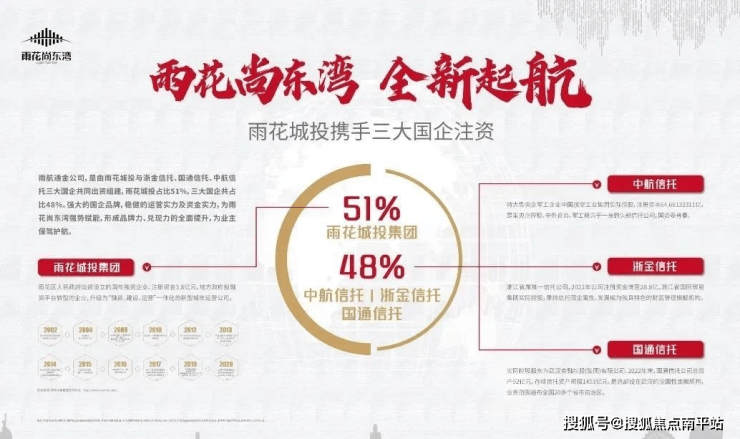 国企领航保质量,由雨花城投与浙金信托、国通信托、中航信托三大国企共同出资组建,雨花城投占比51%,三大国企共占比48%