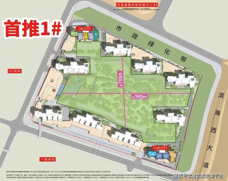 排布上,方方正正的基地采用楼栋错落围合式布局,拥有约110米的超大楼间距,配合约190米的横向跨度,形成约2.7万方的IMAX级中庭园林,部分楼栋甚至可观园海双景。相比很多楼盘动辄栋距50米、园林1万平就成为卖点,七星湾TOD三期简直就是建在公园里的家!
