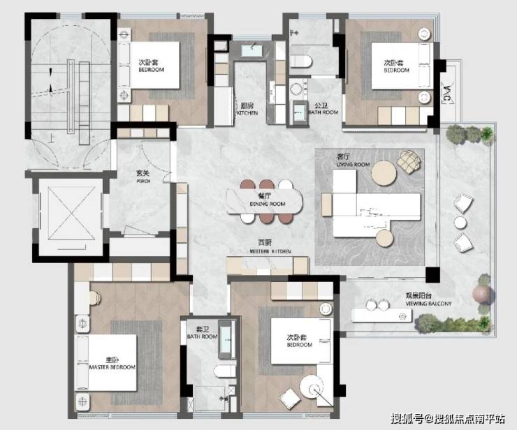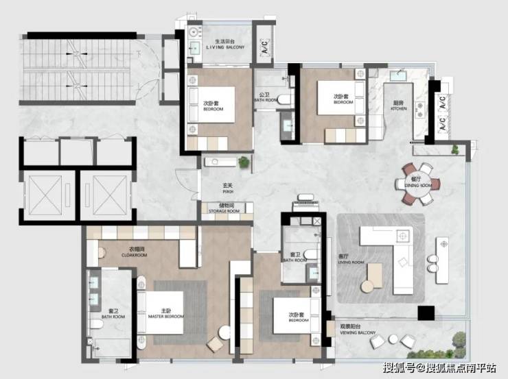 户型这次设计也很有创新。以建筑面积约141㎡户型为例,做一个分析: