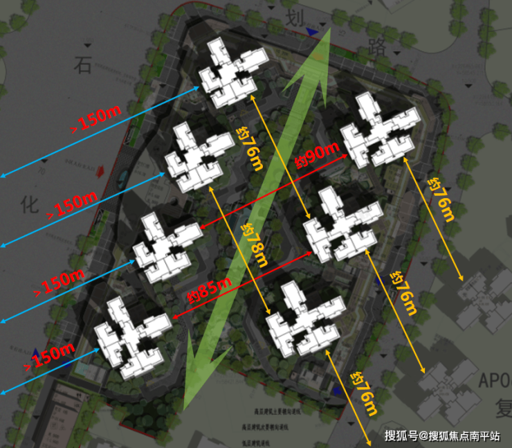 小区内部楼栋的主视线范围,南向间距达到76米-90米,东西向平行的楼距约50米;