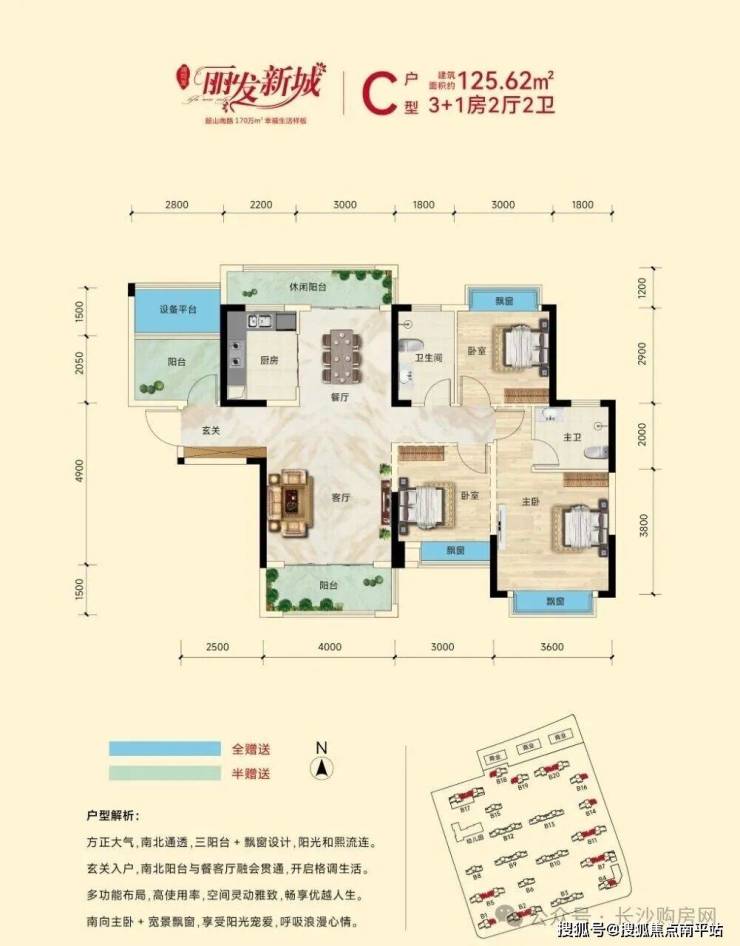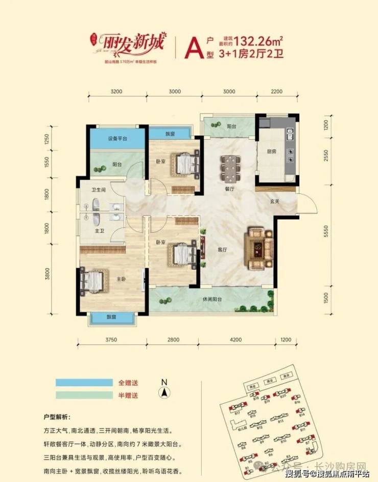 市场罕见2T3H、2T2H纯板式设计。超高赠送面积,多阳台、多飘窗设计,舒居首选。106-125-132-143-165㎡全龄户型,方正实用。