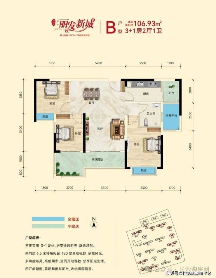 加赠送得房率高达93%,三开间朝南,南北通透,动静分区。三阳台+三飘窗设计,全屋阳光和煦流连。