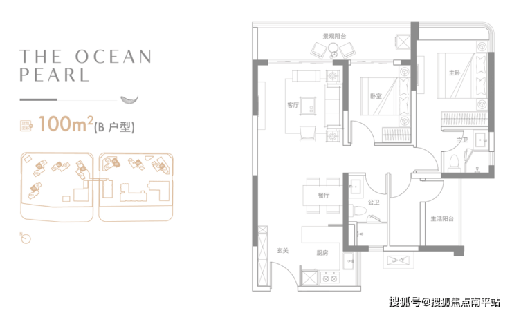 100平米的户型,首别有B户型和F户型两种产品,都能够做到三开间望海,同时为主套间设计,并打造了270度的飘窗,可以更大程度上确保景观面。