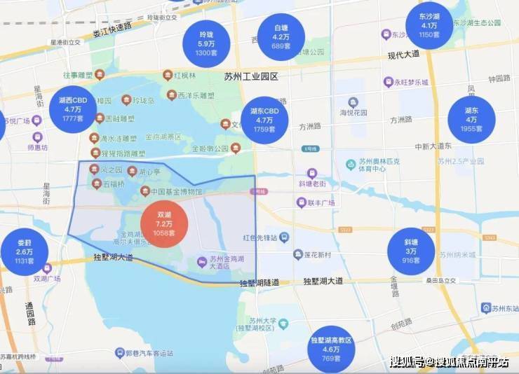 双湖,作为苏州楼市的终极顶豪板块——科创总部林立的产业势能、多轨交汇的枢纽能级、一枝独秀的资源密度,共同构筑起了双湖顶豪的“资产护城河”。从市场价值维度来说,双湖占据苏州千万级豪宅成交的半壁江山,论塔尖资产的密度和价值高度,这里毫无疑问优于湖东、湖西、奥体等园区新秀。苏州六区,园区最园区之中,双湖为王双湖7.2万/㎡的均价是湖东/湖西CBD的165%