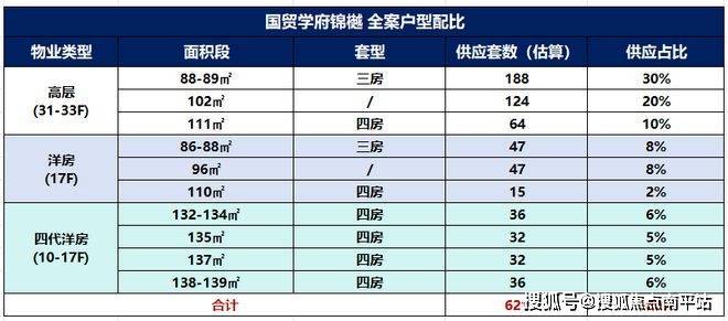 31至33层高层产品涵盖88-111平三至四房,占比60%、17层洋房产品涵盖86-110三至四房产品,占比18%、四代洋房产品涵盖132-139平四房,占比22%。