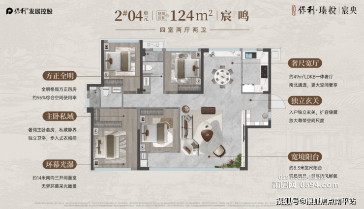 如果是想追求更多房间的改善居住体验,可以关注 124㎡四房。全明格局方正舒适四房,约96%综合空间使用率,实用面积大。更大的餐客厅空间,8.3米宽阳台,各个房间尺寸阔绰,居住升级感明显。