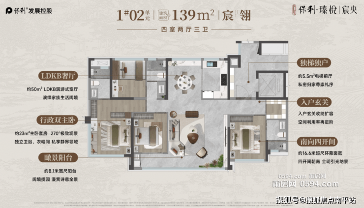 139㎡的户型,那就是更高级改善了。独梯独户,电梯前厅都是你家的,私密性高。16.6米四开间朝南,在家尽揽小区园林景观。餐客厅就更豪了,空间尺度感向大平层看齐。而且双主卧尺度,270度极致观景,二胎三胎都能满足。