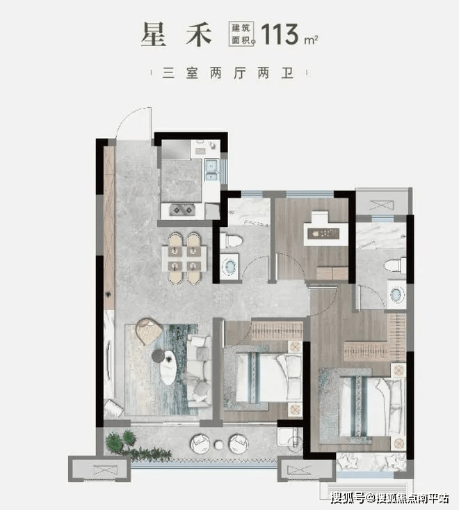 113㎡三室:1.5-1.7万/㎡,总价168-185万(主推1#、2#)。