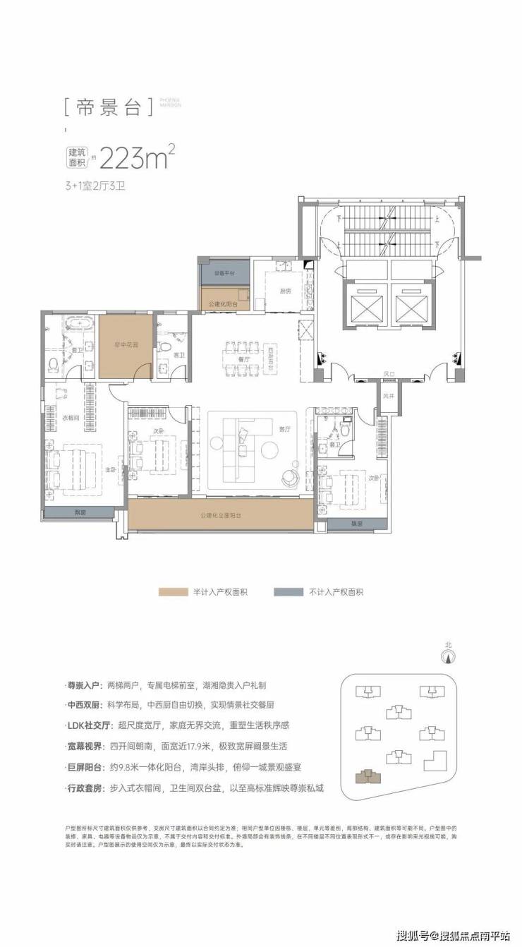 约223㎡纯粹平层:中西双厨、LDK社交厅、面宽约17.9米、4开间朝南、约9.8米一体化阳台、(步入式衣帽间、浴室双台盆)行政双套房。