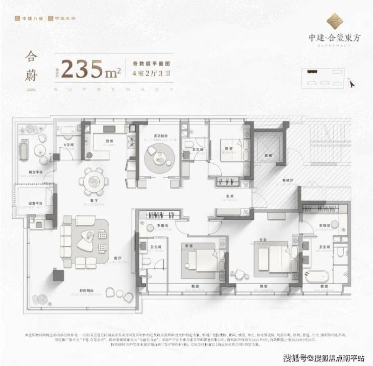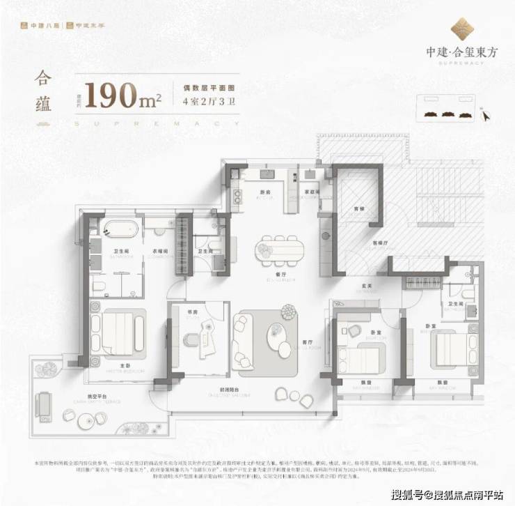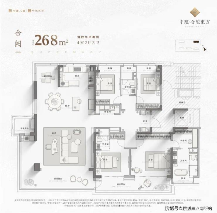 除了目前已公开的建面约190㎡和建面约235㎡的样板间外,中建·合玺东方还有建面约268㎡的更大面积段的户型产品,露台端厅也是一样不落,更奢阔的空间尺度,更加能够提升生活品质和居住体验。