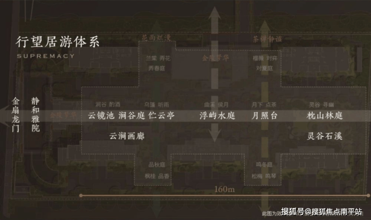 约80%土地用于造景,师法瞻园等江南名园,在南京首创“行望居游”造园体系,打造出约160米景观主轴,镜池、画廊、涧谷、浮屿、水庭等元素一应俱全;有高有凹、有曲有深、有峻而悬,再现王希孟《千里江山图》的气魄。