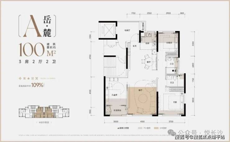 该户型实得面积约109.2㎡,得房率高达109%(含电梯厅),堪比老规128㎡的空间。