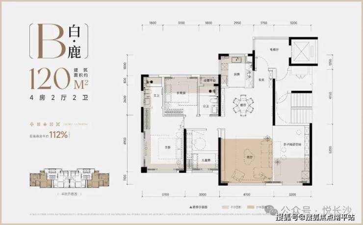 该户型实得面积约134㎡,得房率高达112%(含电梯厅),堪比老规134㎡的空间。